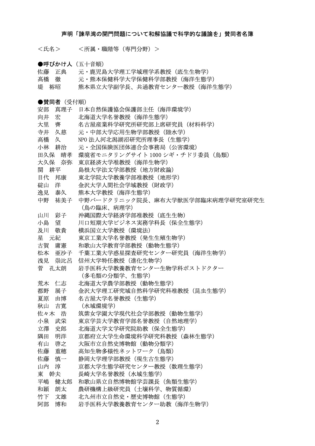 「諫早湾の開門問題について和解協議で科学的な議論を」諫早湾の開門をめぐる裁判で福岡高裁が提案した和解協議に関して、自然科学に携わる研究者を中心とした69名と1団体が連名で声明を発表
